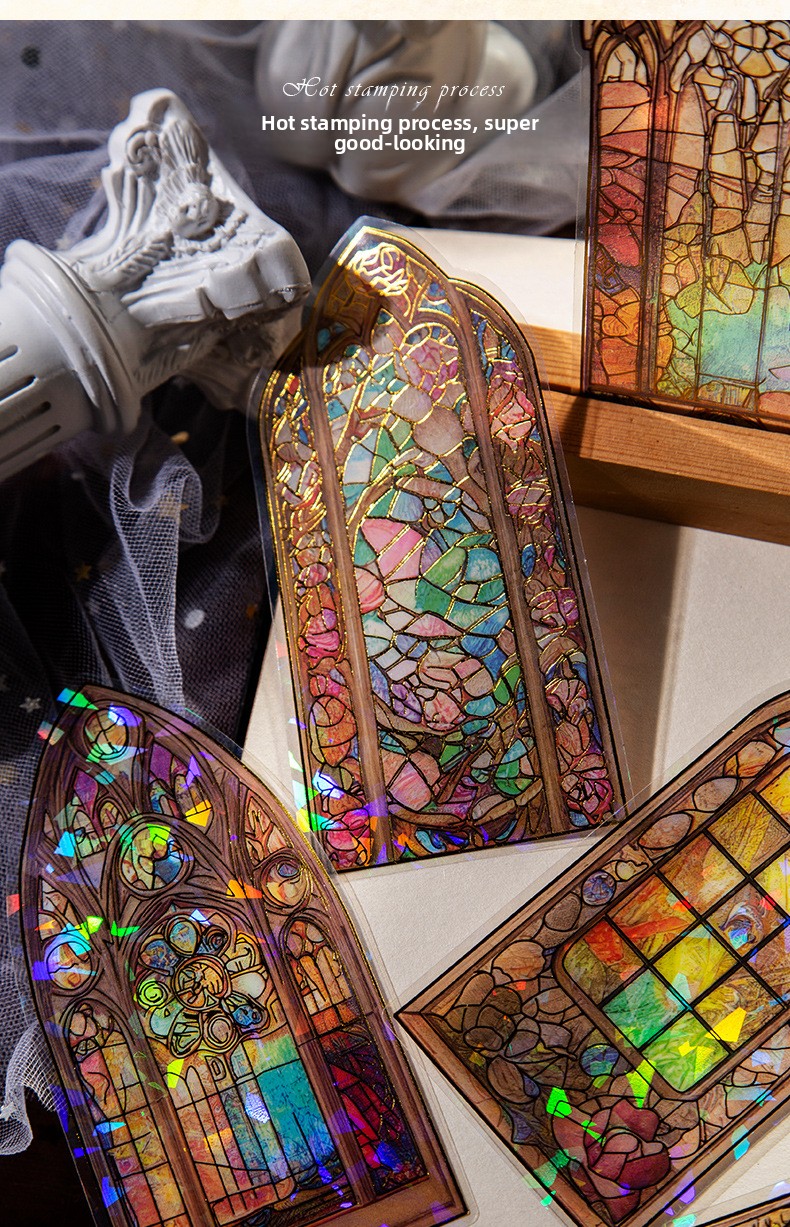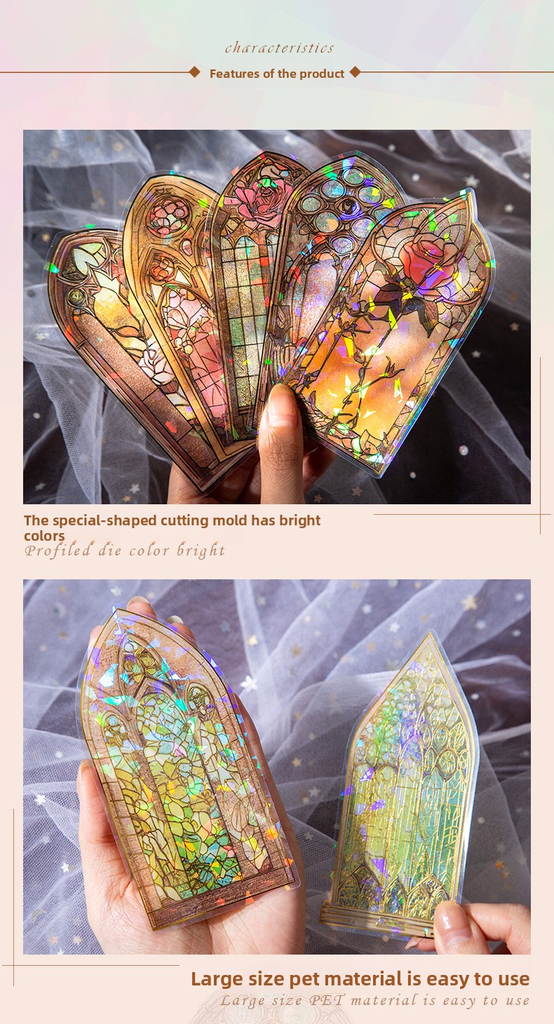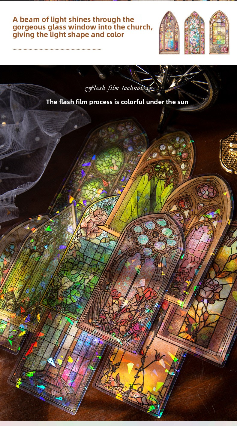 These elegant PET stickers are inspired by classic stained-glass architecture, featuring intricate window designs filled with vibrant colors and shimmering light effects. Each piece captures the magical glow of sunlight passing through antique glass, creating a dreamy atmosphere on every page.
