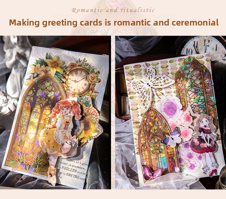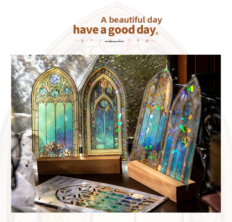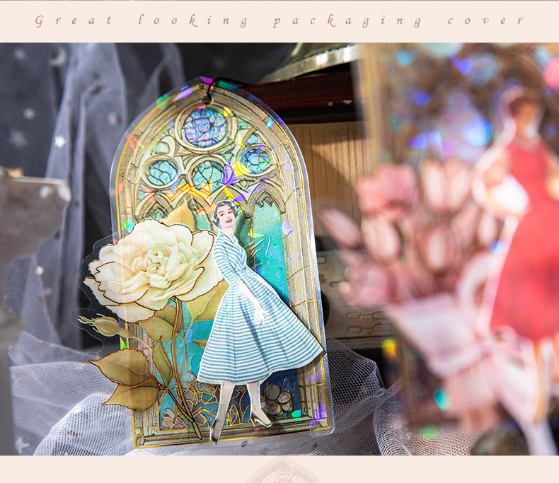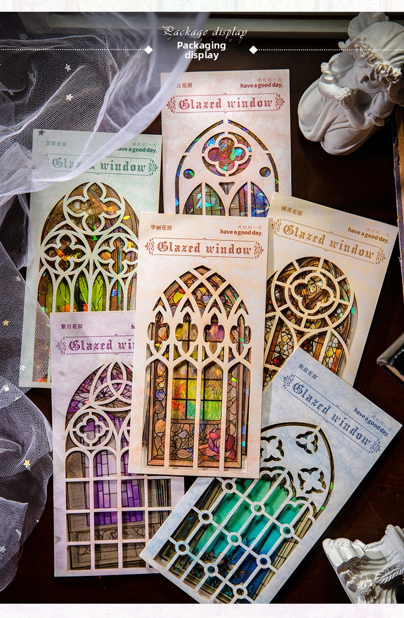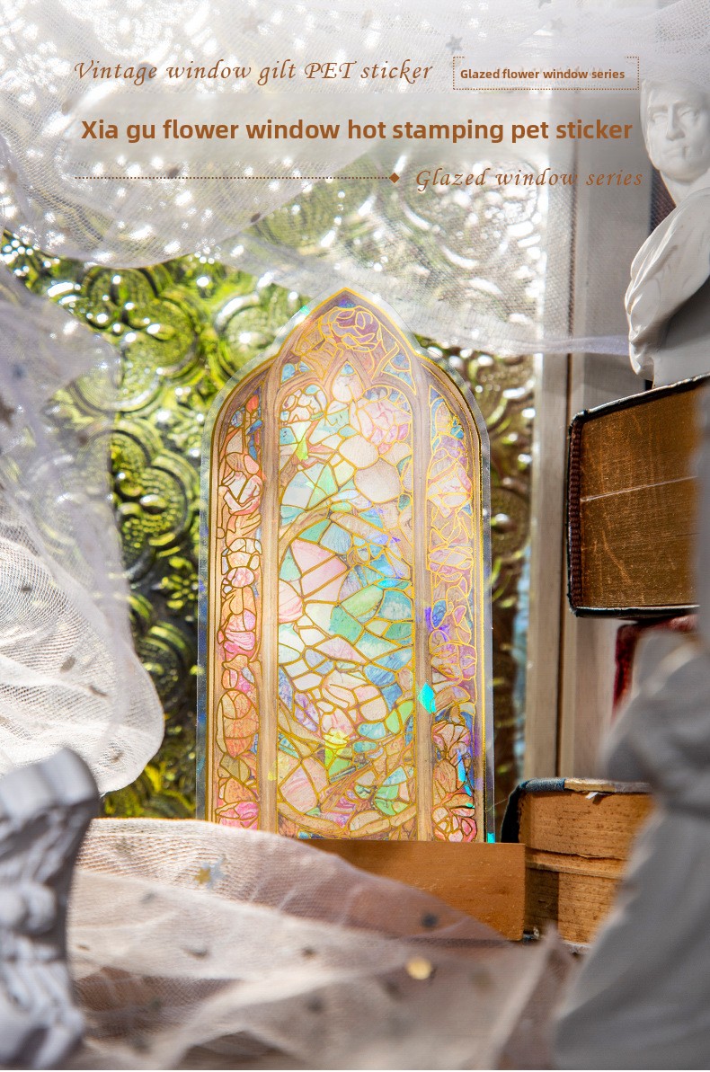 These elegant PET stickers are inspired by classic stained-glass architecture, featuring intricate window designs filled with vibrant colors and shimmering light effects. Each piece captures the magical glow of sunlight passing through antique glass, creating a dreamy atmosphere on every page.